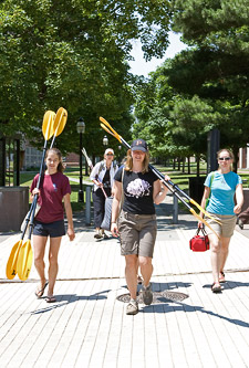 The students in the summer research program divide their time between two work areas -- their bright, airy laboratory in Guyot Hall and their other "laboratory," Lake Carnegie, located a 10-minute walk down Washington Road. Their kayaks, one of them equipped with sonar used to map the depth of the lake, are stored near the water. But they carry their oars and monitoring equipment.