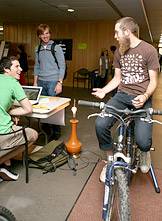 Other student organizations represented included Engineers Without Borders, Eco-Reps, Environmental Justice and U-Bikes. The latter rehabilitates abandoned bikes on campus and then loans them to students. Senior Sean Gleason was staying busy signing up interested students in the group and keeping the pedal-powered light bulb lit.