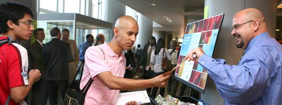 Stu Orefice (right), director of Dining Services, provided information about sustainable food to Alejandro Hernandez, a prospective student from Mexico. Dining Services also offered free samples of organic yogurt, chips and energy drinks, and had a display on recyclable dinnerware.