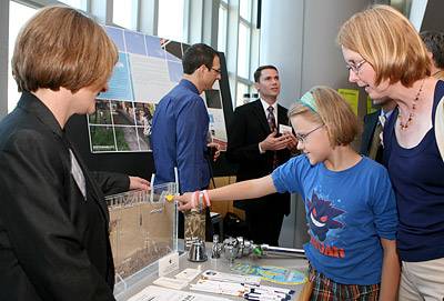 In one corridor, a faculty member was having an animated discussion on the future of the oil supply with two students. At a table, a Dining Services staff member was helping a local high school student with a project on recycling. Behind a bicycle that powered a light bulb, a student organization officer was signing up a new member.