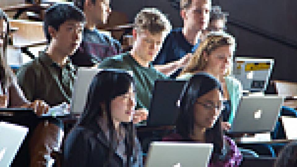 A project Carlee Joe-Wong (front left) pursued as a Princeton junior has grown into a major research initiative in the lab of Mung Chiang (front right), a professor of electrical engineering, to explore how to make smartphones smarter. Joe-Wong, now a doctoral candidate in applied and computational mathematics, is part of a research team in Chiang's EDGE Laboratory working to apply mathematical research to propose fundamental improvements in communication networks, bridging theory and practice. (Photo by Frank Wojciechowski)