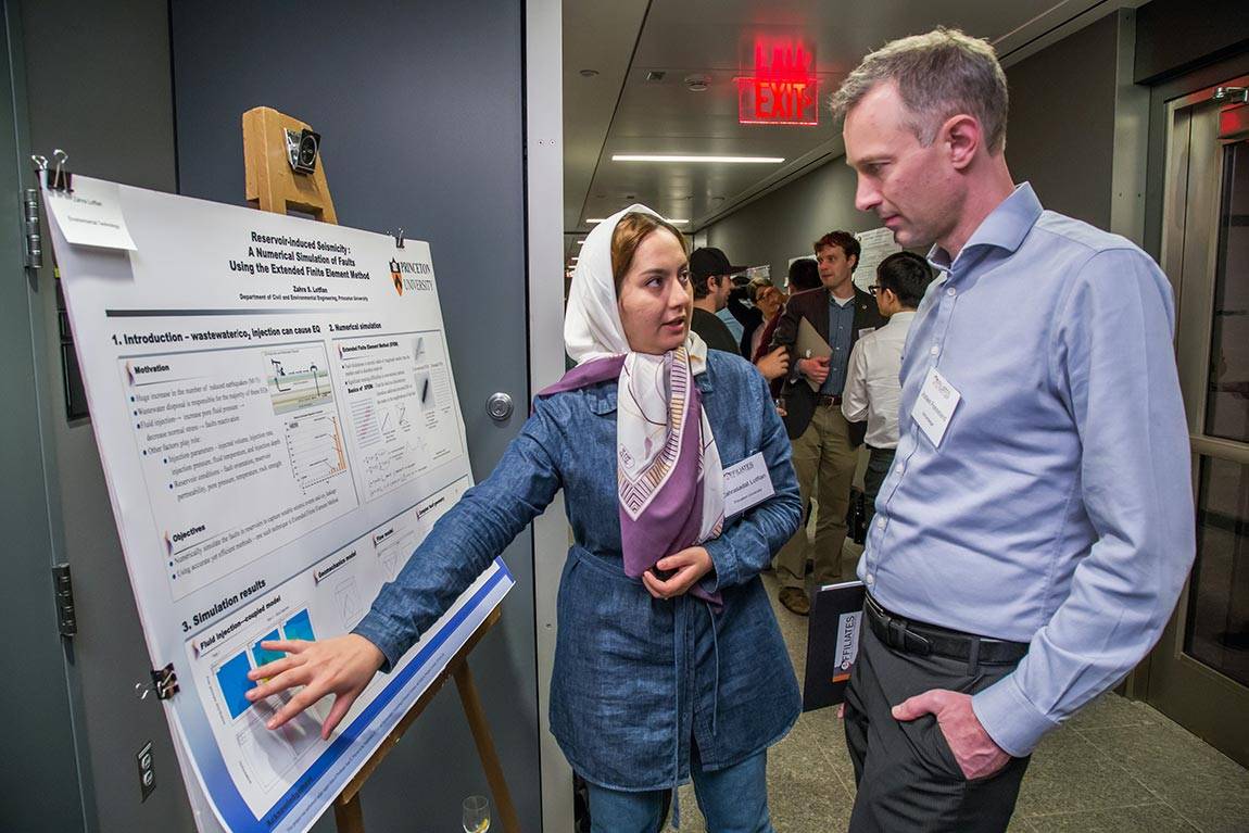 Energy and environmental experts gathered at Princeton University Nov. 11 for the Princeton E-ffiliates Partnership's Fifth Annual Meeting to grapple with fundamental questions about how to build a stronger infrastructure and propose solutions for providing and using energy and water more efficiently. At a poster session, postdoctoral research associate in civil and environmental engineering Zahra Lotfian (left) discusses her research on earthquakes caused by the injection of fluids into deep oil and gas wells. (Photos by David Kelly Crow for the Office of Engineering Communications)