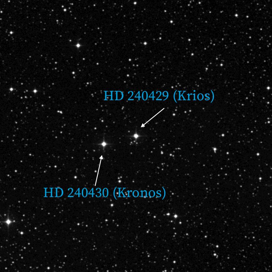Stars HD 240430 and HD 240429, better known as Kronos and Krios, as they appear in the Space Telescope Science Institute’s Digitized Sky Survey. Though these binary stars formed together, their chemical abundances are very different, leading researchers to conclude that Kronos had absorbed 15 Earth masses worth of rocky planets.