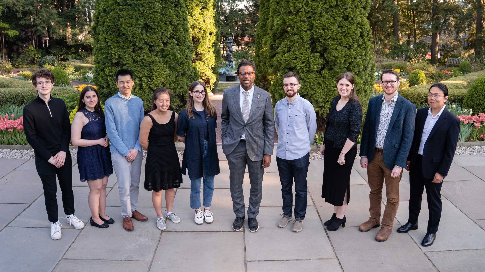 Dean of the Graduate School Rodney Priestley (center) at the school’s Tribute to Teaching reception with awardees (left to right) Nicolas Hommel, Evelyn Navarro Salazar, William Wen, J Jessica Ye, Eleanor Gordon-Smith, Calvin Spolar, Hannah McLaughlin, Christopher Parton and Jeewon Yoo. Not pictured: Aaron Su.