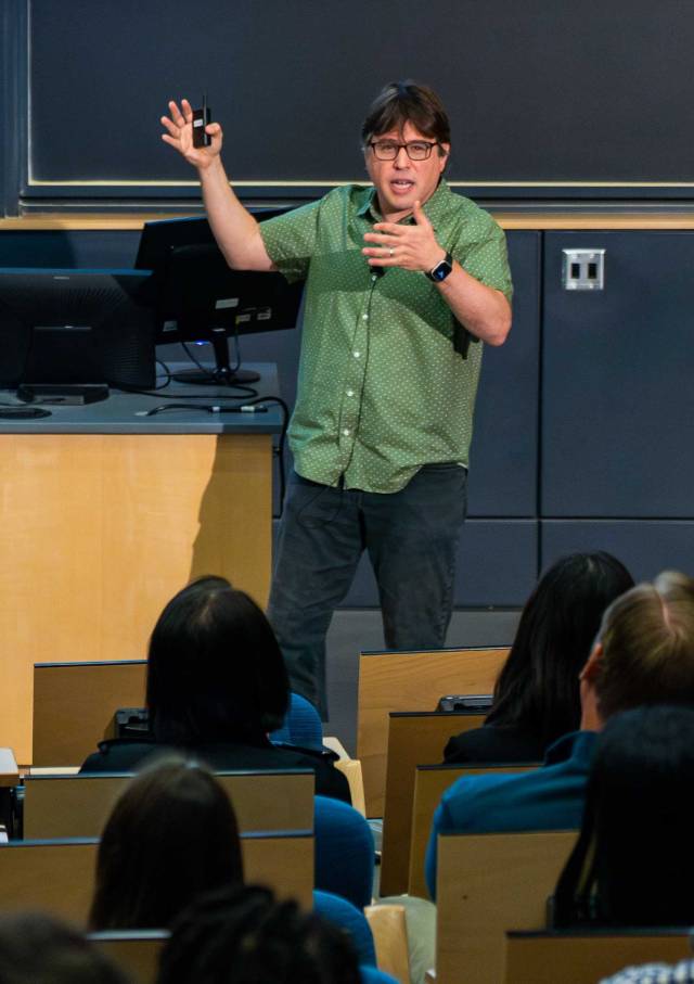 Sociologist Matthew Salganik presents his flash talk, “ChatGPT for People and the Limits to Prediction” at Princeton Chemistry’s Taylor Auditorium.